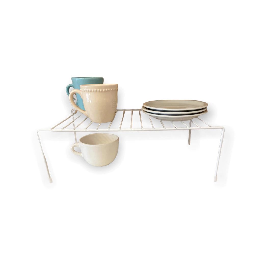 Organizador para alacenas de metal enrejado, color blanco. Otra opción para tener tus platos, tazas y vasos EnOrden y a salvo de los golpes cotidianos.